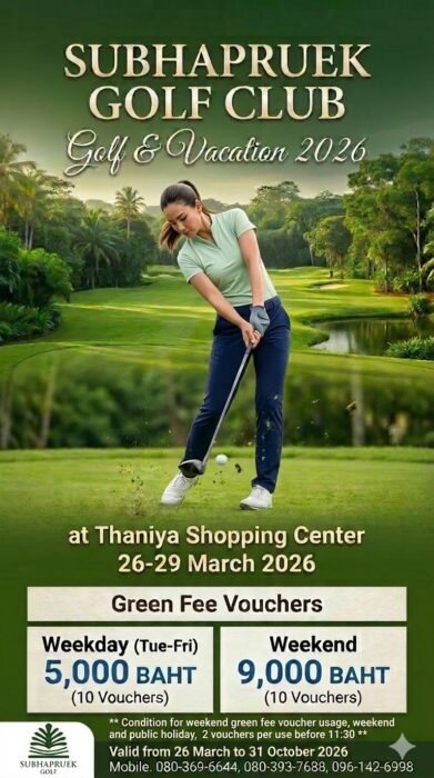 “อยากออกรอบในสนามสวยๆ ในราคาที่คุ้มค่าที่สุดใช่ไหมคะ? 🏌️‍♀️ Subhapruek Golf Club จัดหนักให้เฉพาะในงาน Golf & Vacation 2026 กับแพ็กเกจคูปองกรีนฟีที่ทุกคนรอคอย:
