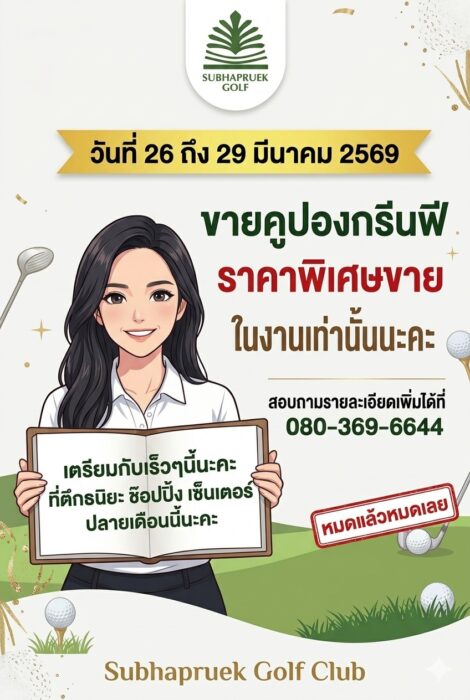 “เตือนแล้วนะ! ใครที่กำลังเล็งคูปองกรีนฟีราคาพิเศษจาก Subhapruek Golf Club เตรียมตัวมาจับจองกันได้ที่ตึกธนิยะ ปลายเดือนมีนาคมนี้ค่ะ